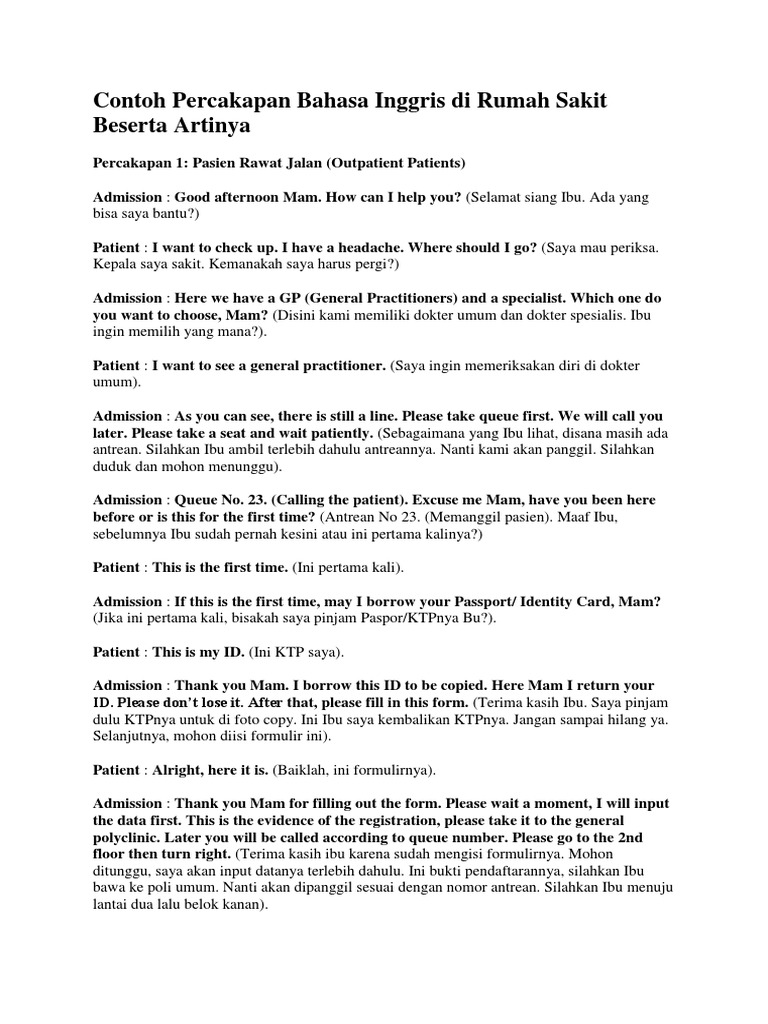 Di bawah ini kakak sudah siapkan contoh dialog bahasa inggris dengan tema berkunjung ke rumah teman. Tidak hanya itu, bahasa inggris pun penting untuk dikuasai oleh mereka yang bekerja sebagai staf rumah sakit, mulai dari dokter, perawat, hingga karyawan administrasi. Di bawah ini disajikan beberapa contoh dialog tentang liburan ke pantai, persahabatan, pendidikan, bisnis, dan pesta ulang tahun lengkap dengan terjemahannya. Video this is the future of medicine; Dialog bahasa inggris pendek saat berkunjung ke rumah teman. Di dalamnya ada tokoh annisa, pegawai klinik, suster yang melakukan pemeriksaan awal dan juga dokter yang memeriksa. Percakapan dalam bahasa inggris untuk 4 orang tentang kesehatan lengkap dengan terjemahannya physical check up dalam bahasa inggris mitha: Malam sebelumnya ibu andi memberikan obat penurun demam, tampaknya demamnya turun tetapi ternyata demam lagi dan lebih tinggi dari sebelumnya disertai sakit tenggorokan. Berikut ini adalah contoh percakapan dalam bahasa inggris dengan pemeran sebanyak 4 orang di sebuah klinik atau rumah sakit. Marilah simak contoh dialognya dibawah ini. Contoh dialog percakapan di rumah sakit dalam bahasa inggris dan artinya. Untuk mengetahui seperti apa percakapan dalam bahasa inggris yang berhubungan dengan &hellip. Hal ini juga terjadi di luar negeri khususnya bagi mereka yang menggunakan bahasa inggris.