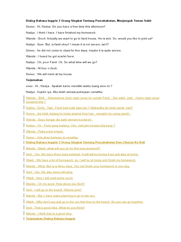 Contoh percakapan 3 orang dalam bahasa inggris di rumah sakit beserta artinya sakit adalah sesuatu hal yang tidak diinginkan … recent posts. Di saat seperti itulah menguasai beberapa kalimat kunci dalam percakapan bahasa inggris di rumah sakit akan dapat membantu. Sebelumya kita juga pernah memberikan contoh percakapan yang hampir serupa dengan artikel ini. Menjenguk seseorang yang anda kenal ketika sedang sakit adalah hal yang lumrah untuk dilakukan. Marilah simak contoh dialognya dibawah ini.